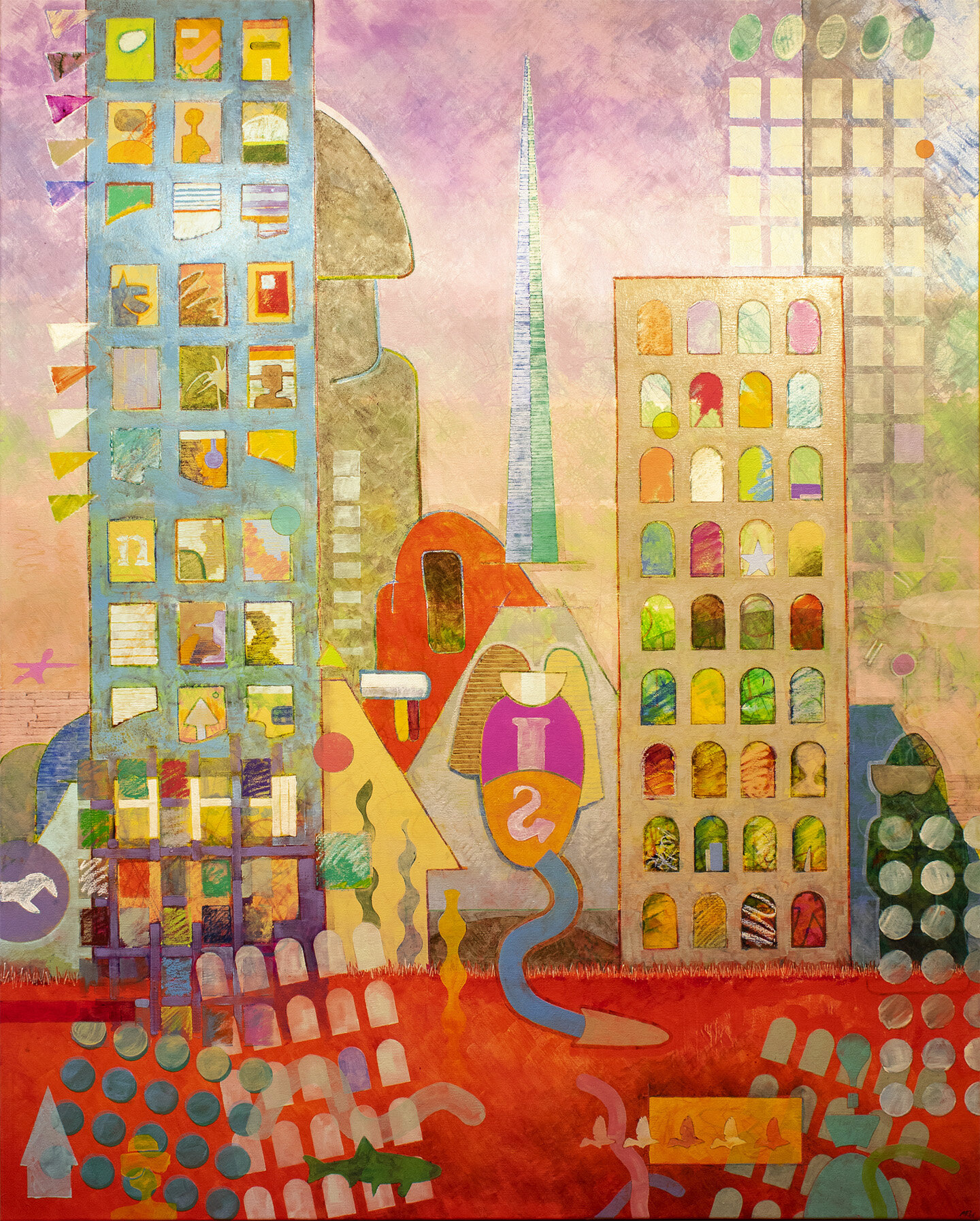 Water St. Studio, #199, 36” x 48”, oil paint, wax, oil pastel, pencil on canvas, 2021.