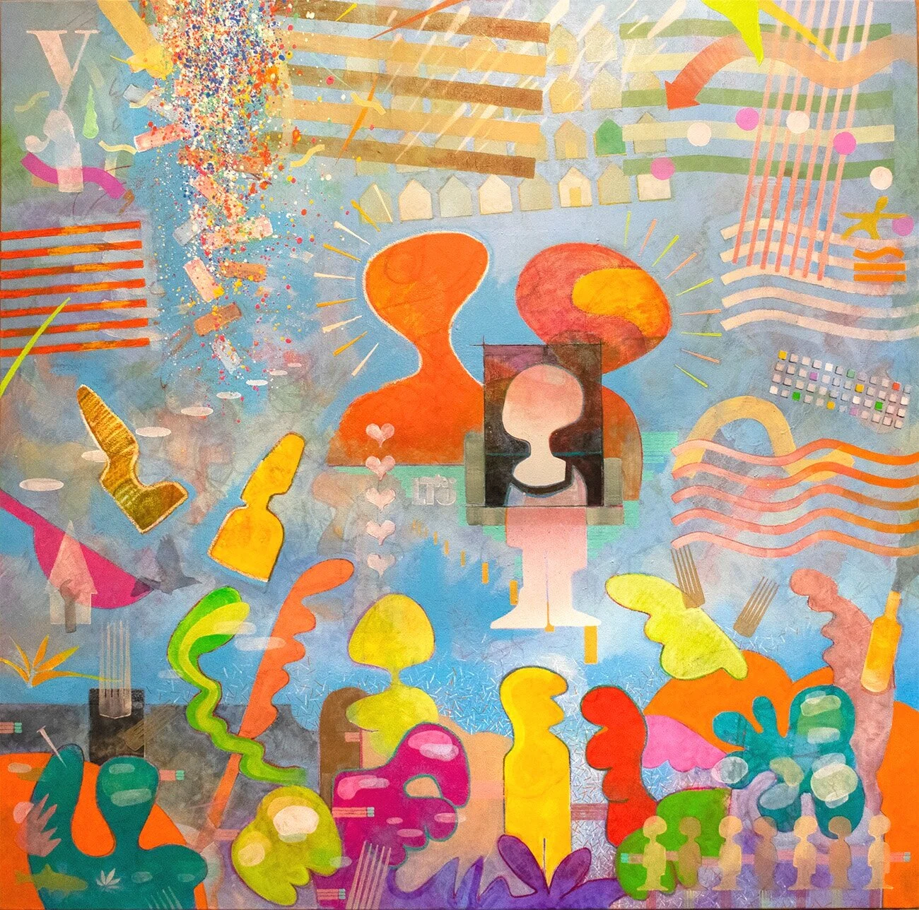 Five Points Studio, #261, 36” x 36”, acrylic & oil paint, wax, spray paint, oil pastel, pencil on canvas, 2022.