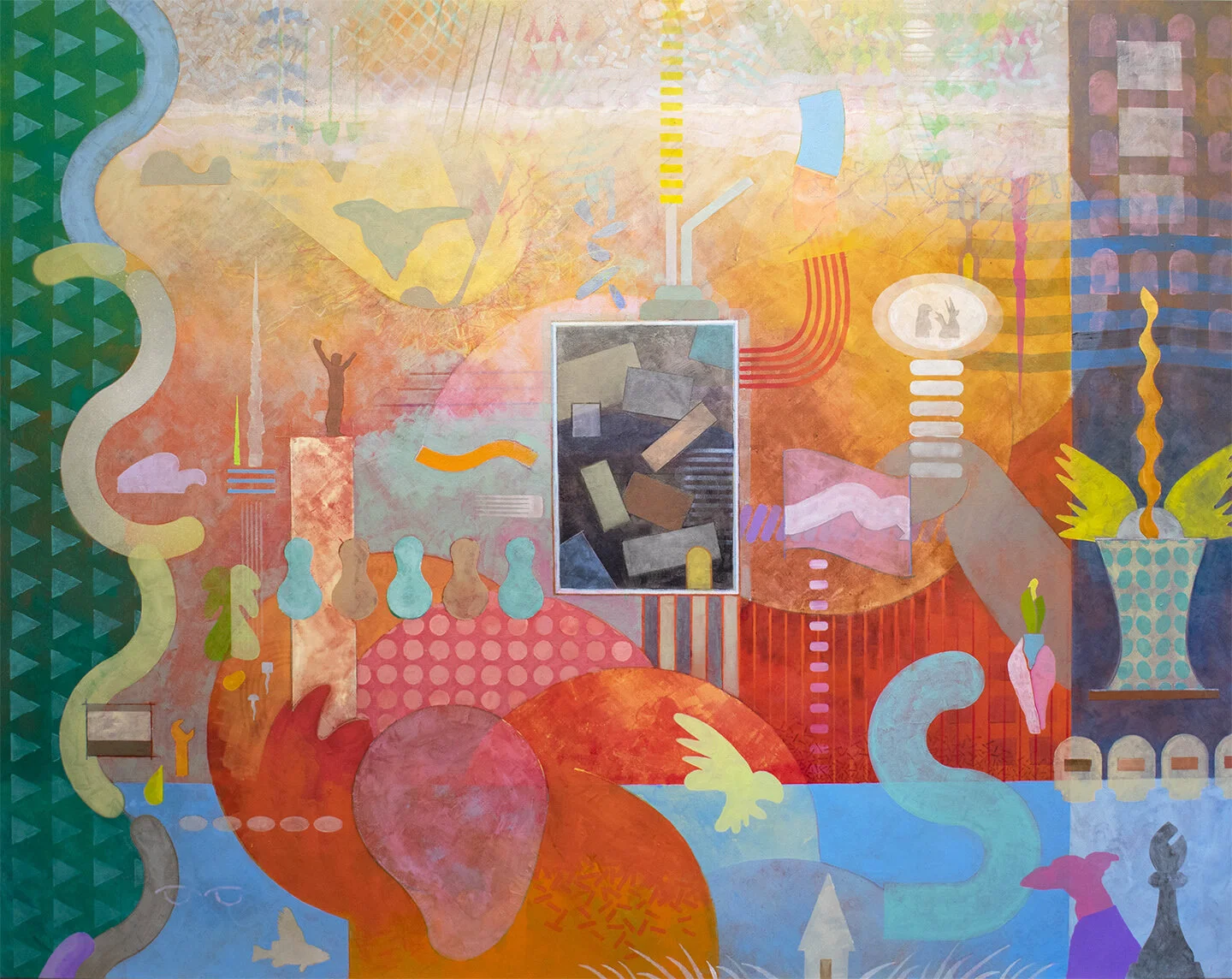My friend John Noelke told me that I am not an abstract painter. He said, the work is narrative and riffs with abstract motiff. That may be true but I am a product of the New York Aesthetic, my storage unit will attest to that. This painting, just off the easel, is my response to him, and it was was difficult for me. That red box wants to be filled, but remains a question.